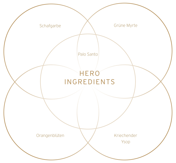 Achillea Millefolium (Schafgarbe) Flower Water1, Bursera Graveolens (Palo Santo) Flower Water2, Citrus Aurantium (Orangenblüte) Flower Water1, Myrtus communis (Grüne Myrthe) Flower Water1, Hamamelis Virgiania (Zaubernuss) Flower Water1, Rosa Damascena Flower (Damszener Rose) Water1, Calendula Officinalis Flower (Calendula) Extract1, Olea Europaea (Olive) Fruit Oil1, Lactobacillus Ferment, Rosa Canina (Hagebutte) Fruit Oil1, Sclerocarya Birrea Kernel (Marula) Oil2, Bursera Graveolens (Palo Santo) Oil2, Citrus Aurantium Flower (Orangenblüte) Extract1, Hyssopus Officinalis (kriechender Ysop)3, Citrus reticulata (Grüne Mandarine) Flower Extract1, Styrax Tonkinensis (Benzoe Siam) Oil1, Helichrysum Italicum (Immortelle) Flower Oil1, Agonis Fragrans (Fragonia) Oil2, Tanacetum Anuum (Blauer Rainfarn Tansy) Oil3, Alcohol1, Benzyl Benzoate4, Benzyl Cinnamate4, Benzyl Salicylate4, Cineol4, Citral4, Citronellol4, Ethanol4, Eugenol4, Farnesol4, Geraniol4, Limonene4, Linalool4